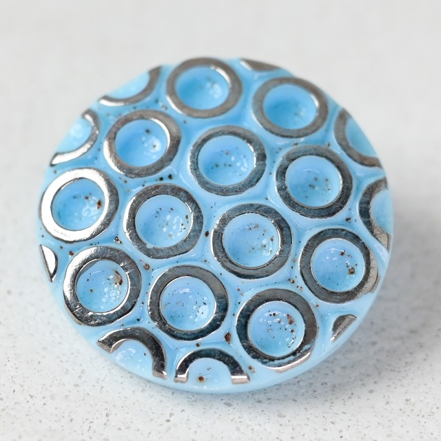 【商品説明】 昭和レトロな雰囲気漂う。チェコのアンティークボタン 1925年のパリ万国美術博覧会で花開いた、アールデコと言われる装飾の一つの傾向。 そんな時代に生まれたチェコのボタンです。 美しい幾何学模様が特徴です。 アクセサリーに加工の他、雑貨などの装飾として。 サイズ:約22mm 入数:1個 製造地:チェコ
