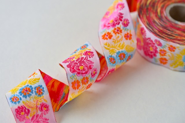トルコから届いた華やかな刺繍リボン。 繊細な花柄と鮮やかな色合いが魅力のジャガードリボンです。 ブルー系(青×紫×水色)とピンク系(ピンク×黄色×オレンジ)の2柄をご用意しました。 どちらも幅広の3.2cmで、存在感のある仕上がりです。 ご注文時に【ご希望の柄】をオプションからお選びください。 【商品仕様】 ・幅:約3.2cm ・長さ:1m ・素材:ポリエステル ・製造国:トルコ 【バリエーション】 ①ブルー系 ②ピンク系 【おすすめの使い方】 ・ヘアアクセサリーやブレスレットに ・バッグやポーチの装飾に ・プレゼントのラッピングに ・衣装や雑貨のカスタムにも◎ 美しい光沢と立体的な刺繍が目を引く、特別感のあるリボンです。 お気に入りの色を見つけて、手作り時間をもっと楽しく!!