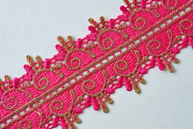 ピンク×ゴールドの刺繍レースリボン(幅5.5センチ・1メートル)