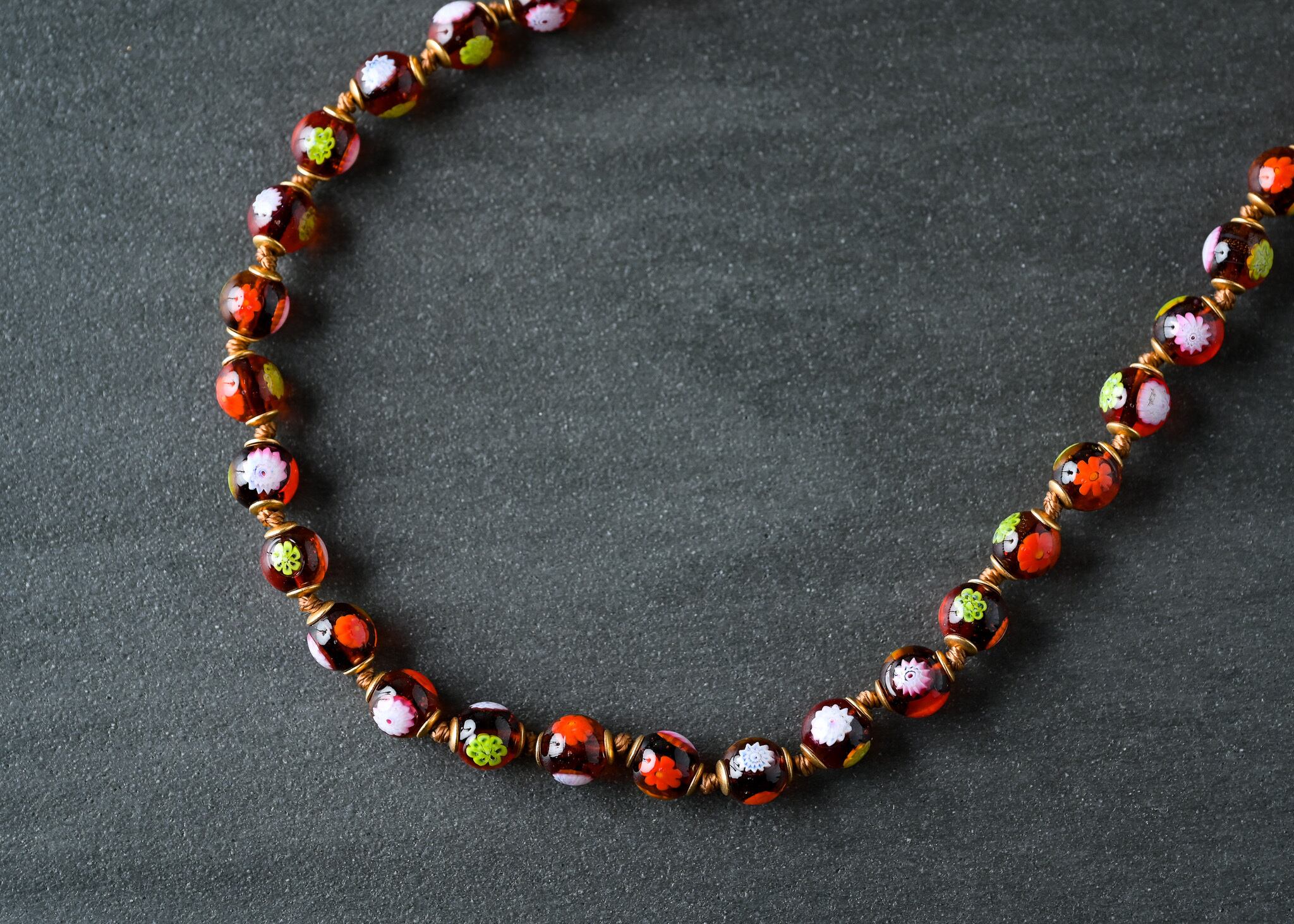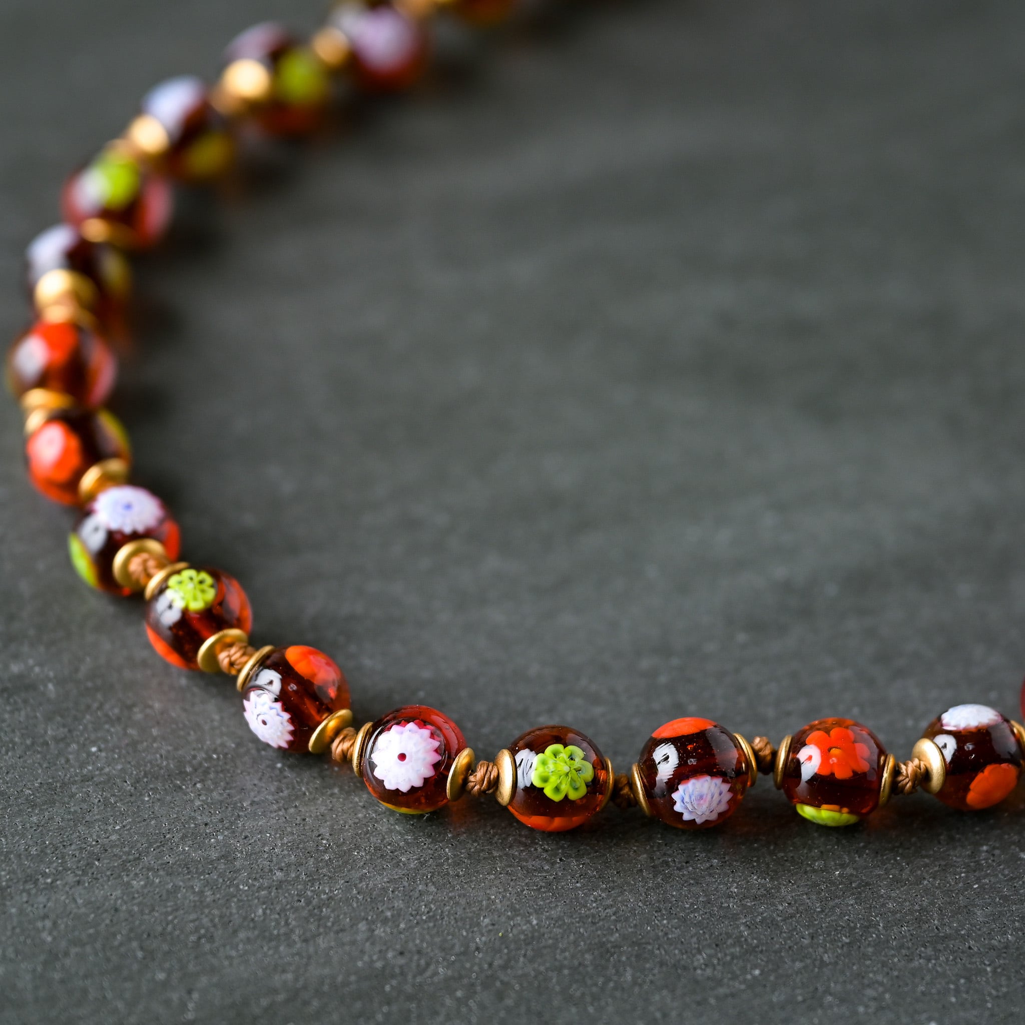 全部違うから楽しい!ミルフィオリといわれる花柄がビーズに埋め込まれているビーズをふんだんにつかったネックレスです。