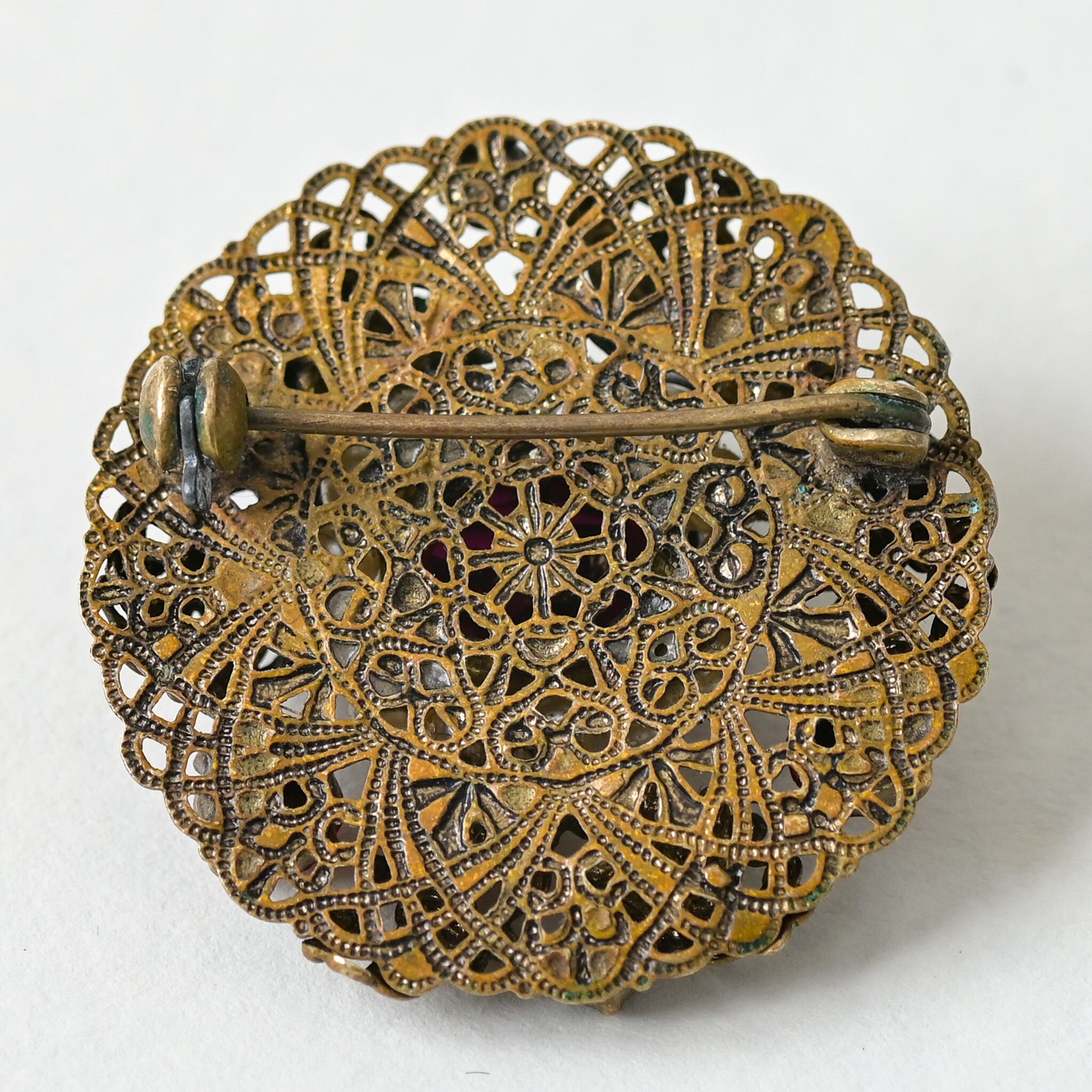 土台は透かし模様の金属細工で構成され、裏面からも美しさが際立つ丁寧な造り。経年による色味の変化も味わい深く、ヴィンテージらしい魅力をたっぷりと感じていただけます。