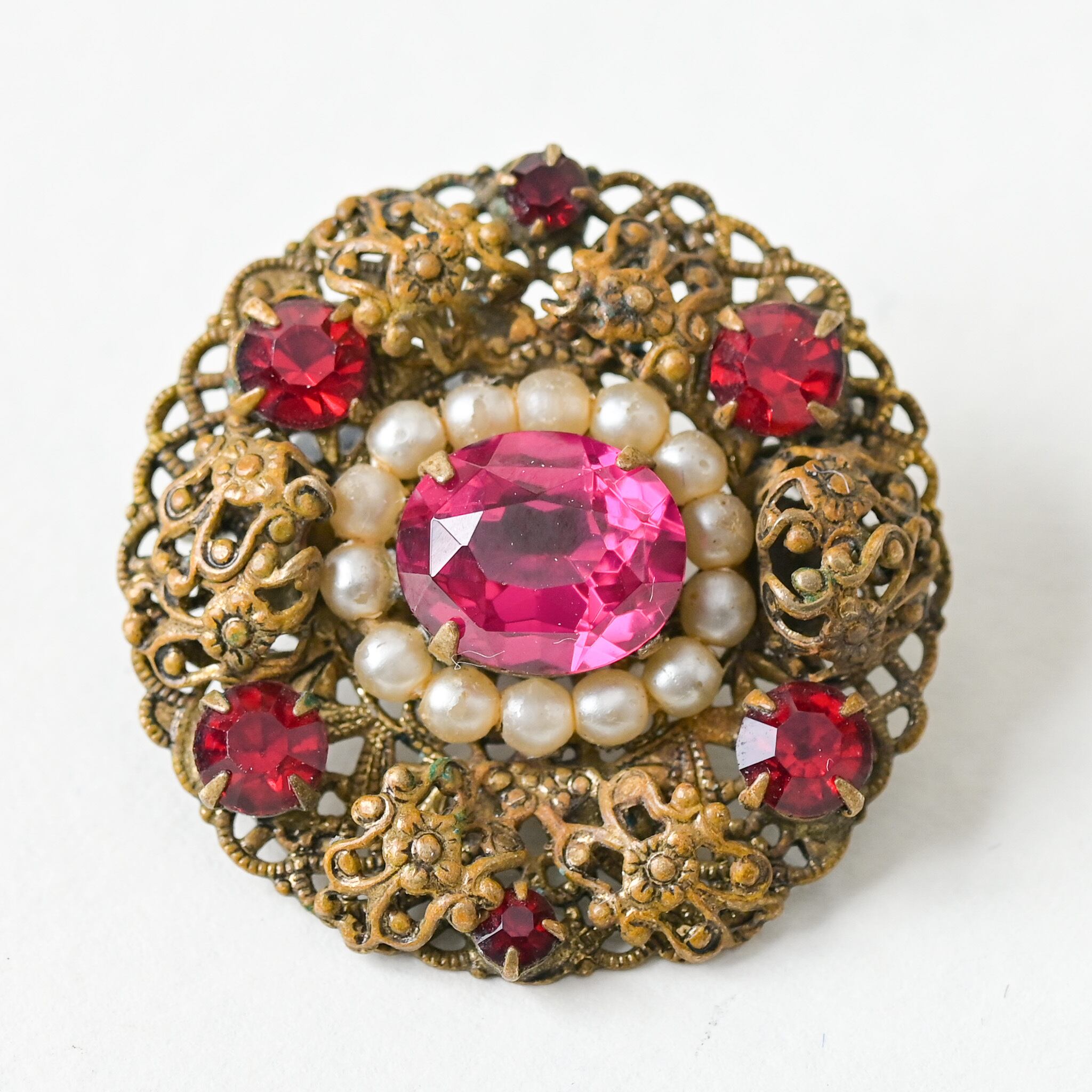 中央に輝く大きなピンクのビジューを囲むようにパール調パーツと赤いストーンが並び、クラシカルで華やかな印象に仕上がっています。