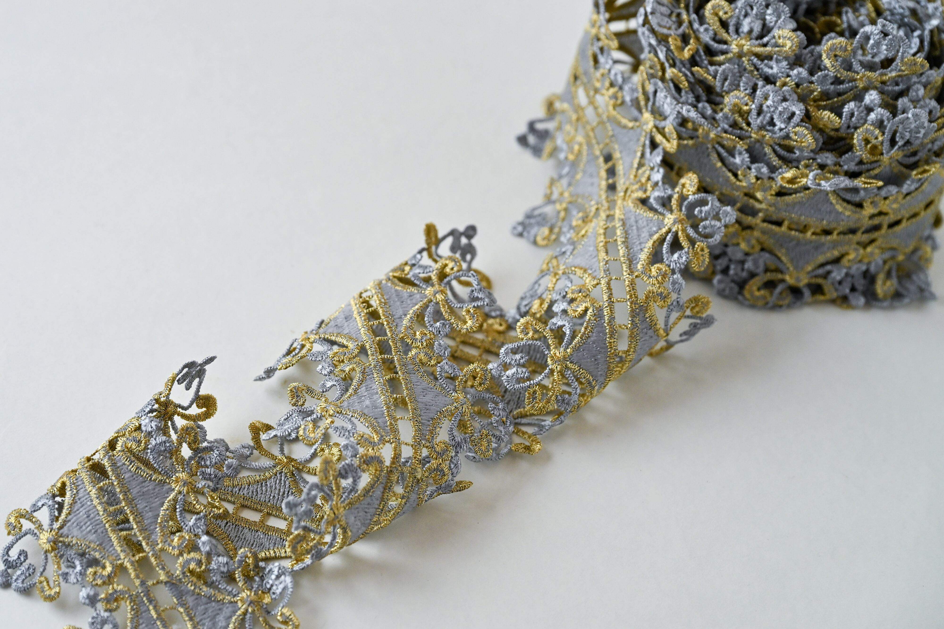 シルバー×ゴールドの立体刺繍リボン(幅8cm・1メートル)