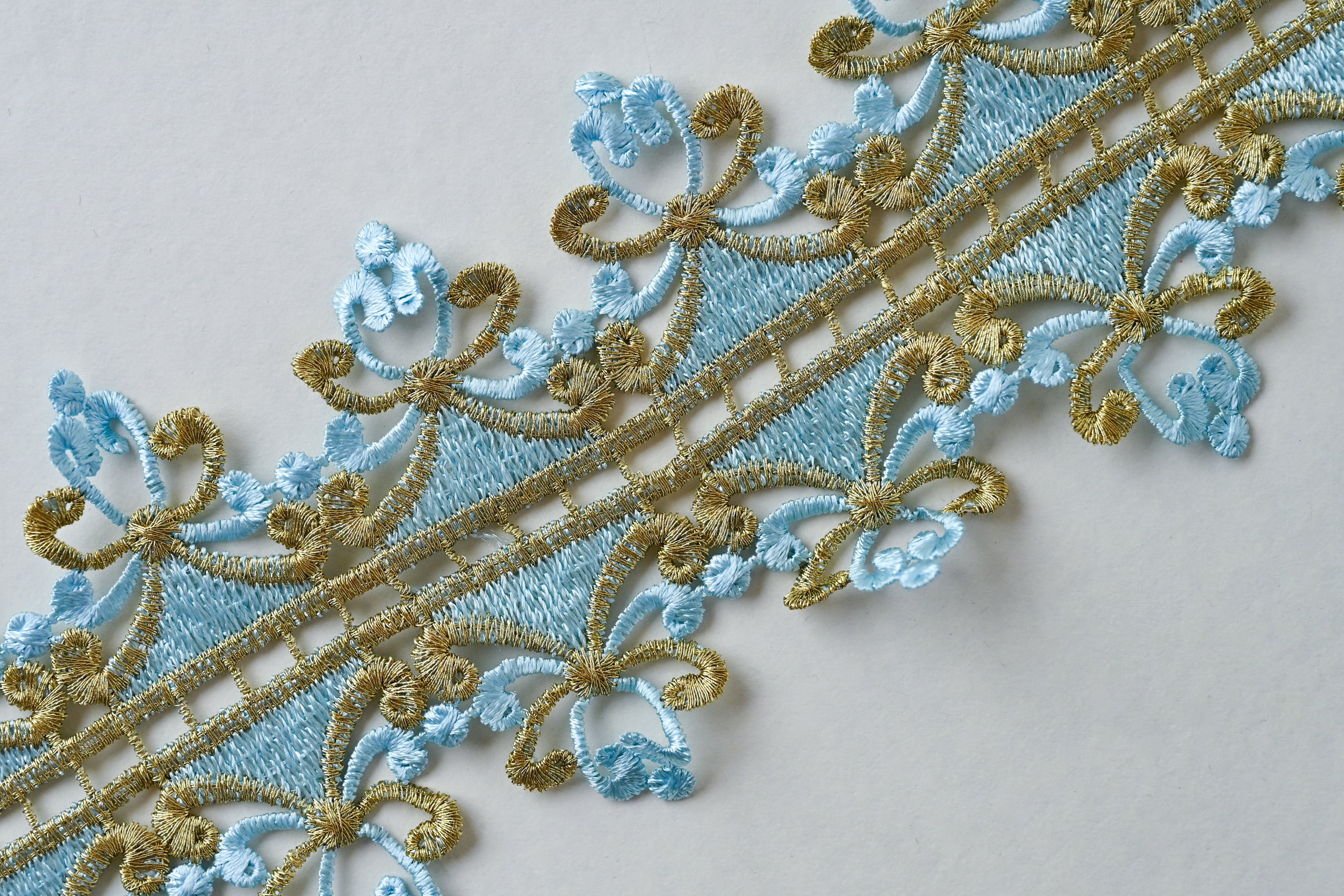 水色×ゴールドの立体刺繍リボン(幅8cm・1メートル)