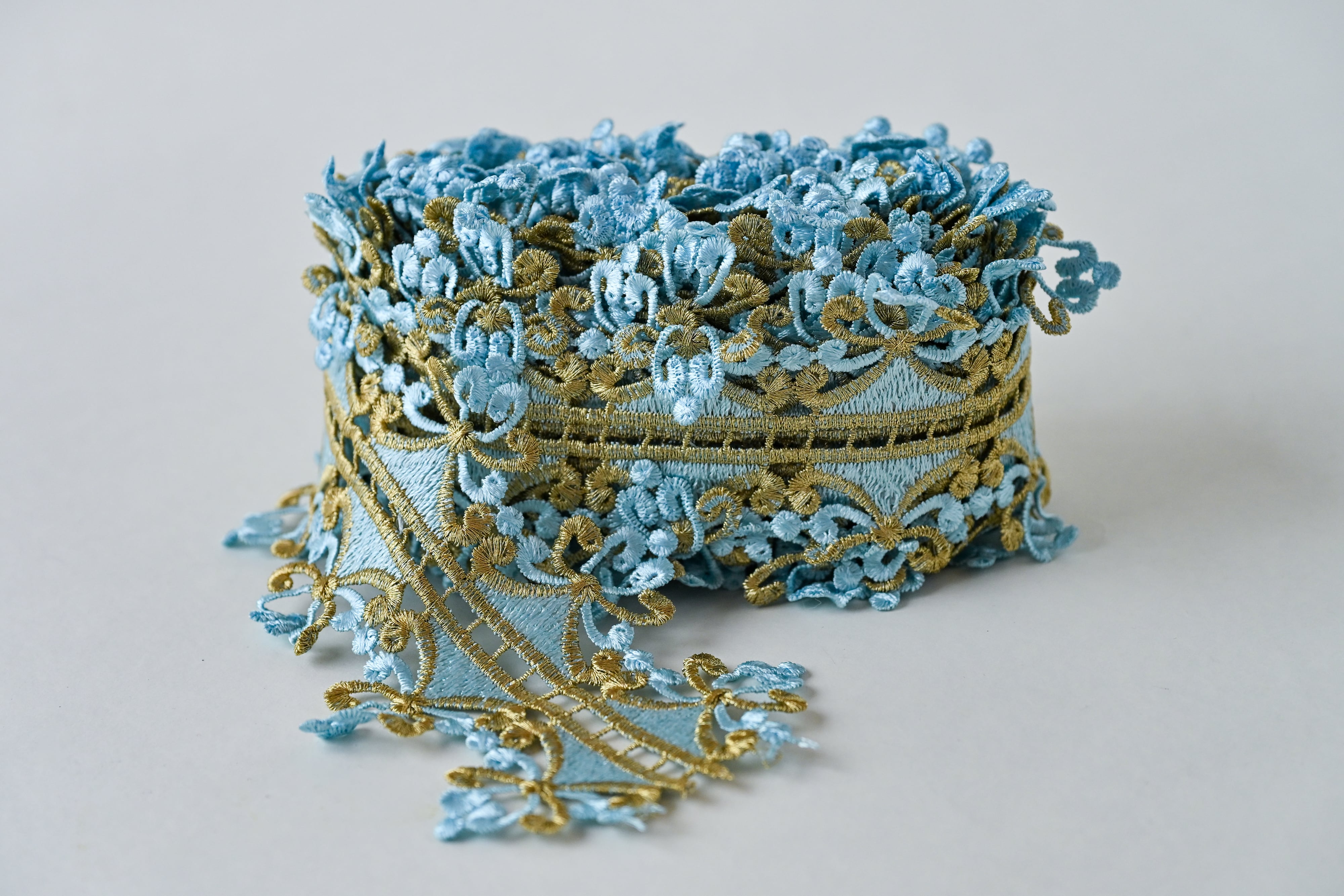 爽やかな水色にゴールドの刺繍が映える、美しい立体リボンです。