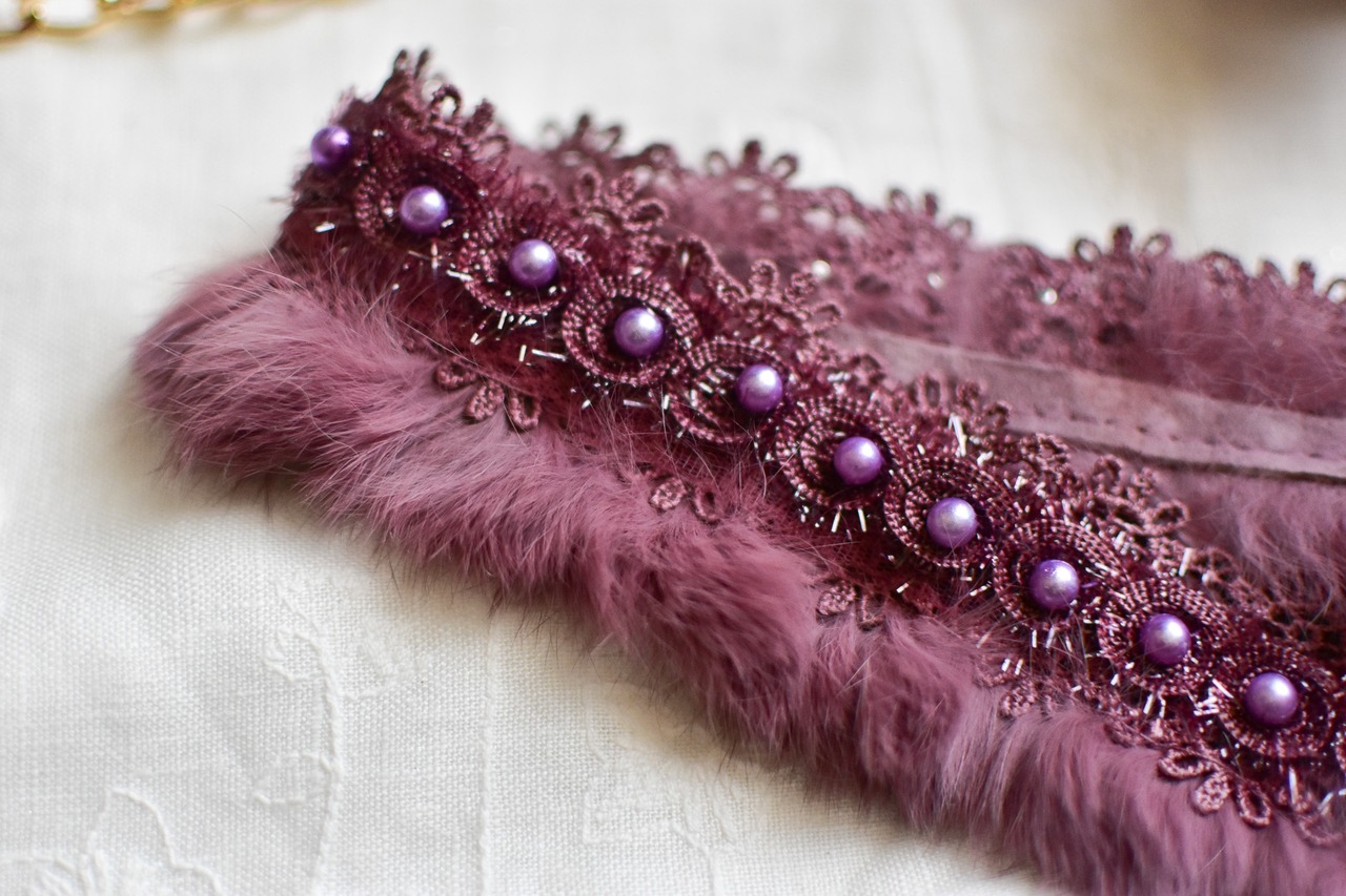 パール×フェザー付き レーストリム パープル 幅約5cm(50cm単位)