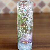 透明の専用フィルムに貼って、ハーバリウム液に入れるとフィルムがほとんど見えなくなり、シールが浮いているように見えます。