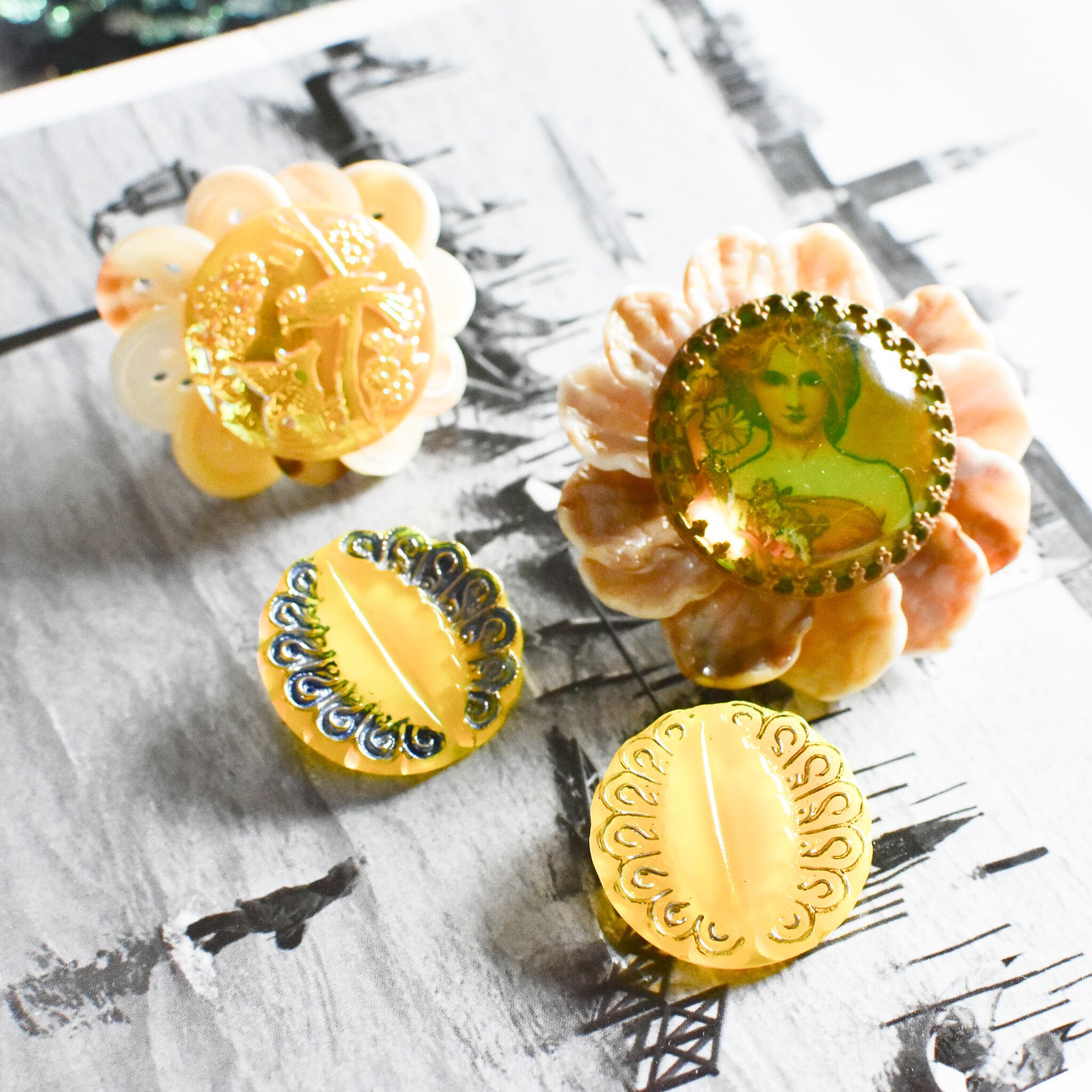 ムーングローガラスと言われる種類のガラスで作られているボタンです。