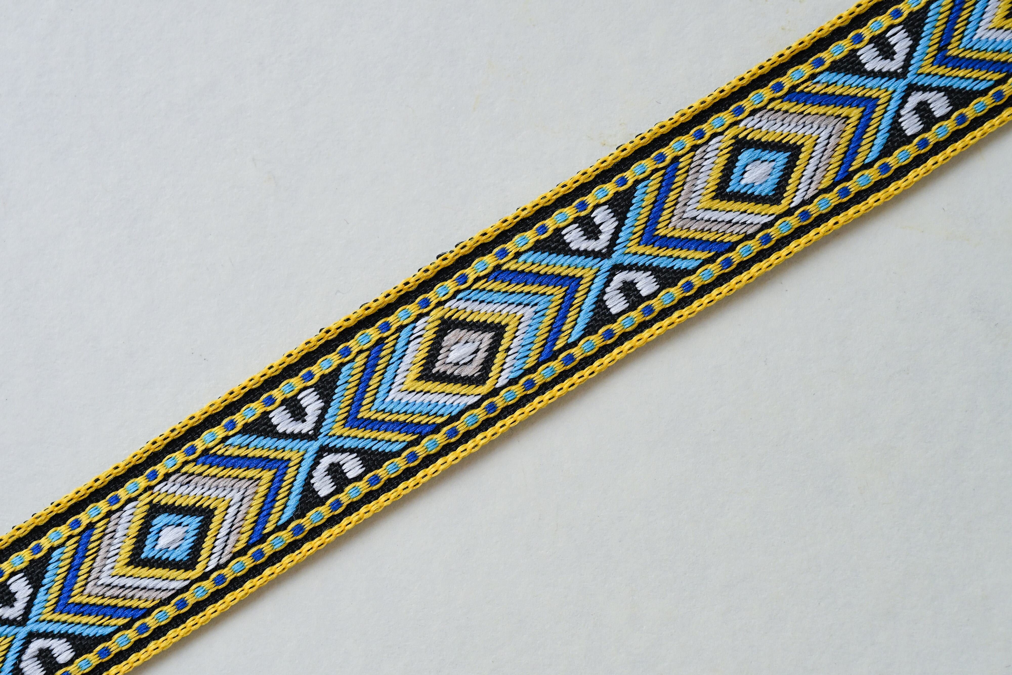 イエローの縁取りと、ブルー&サンドカラーの菱形パターンが印象的。爽やかで明るい雰囲気。